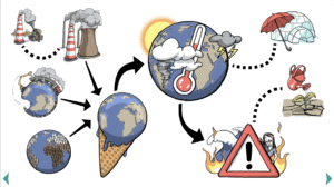 Este recurso educativo consiste en una infografía interactiva que explica los conceptos fundamentales sobre el cambio climático y cómo ellos se relacionan entre sí.
