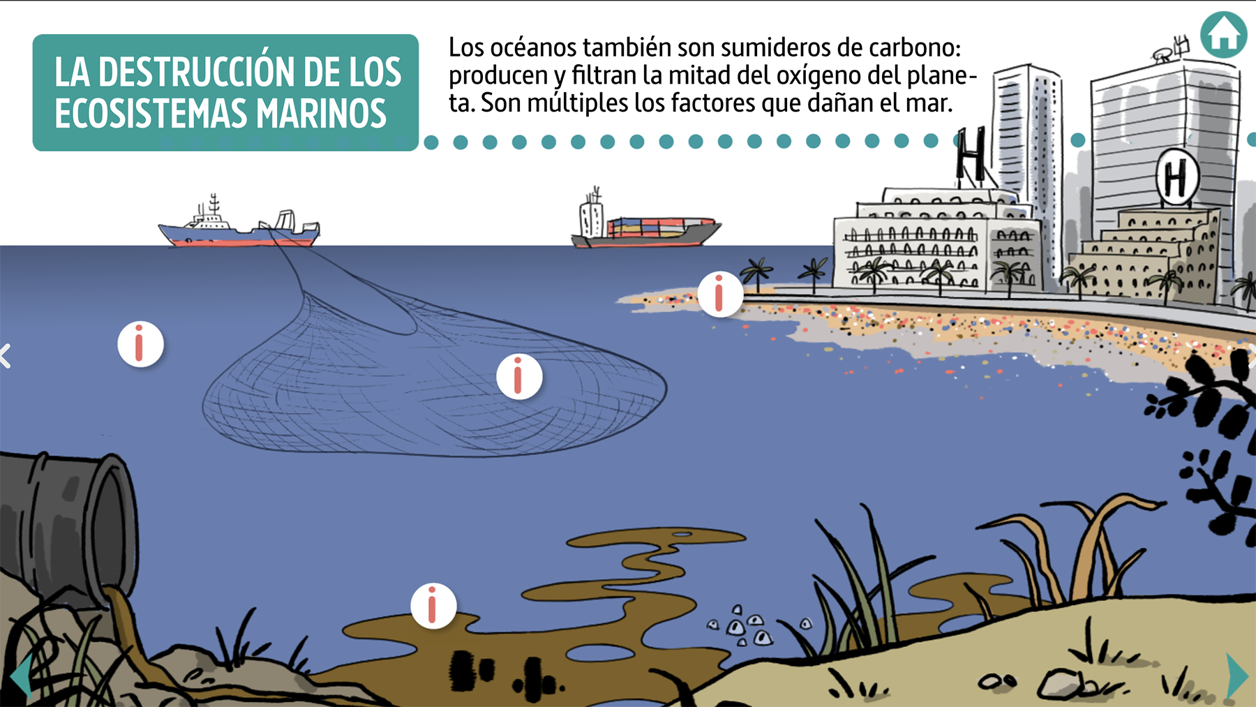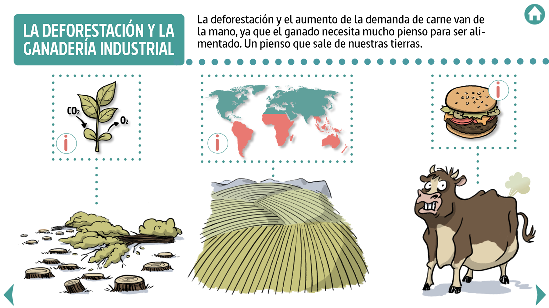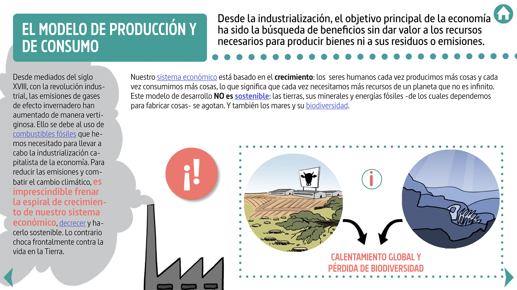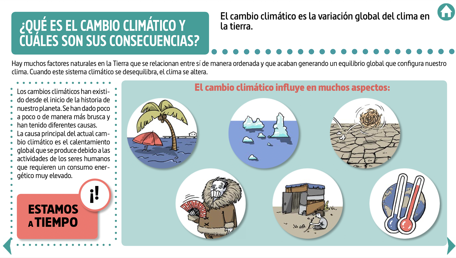 Este recurso educativo consiste en una infografía interactiva que explica los conceptos fundamentales sobre el cambio climático y cómo ellos se relacionan entre sí.