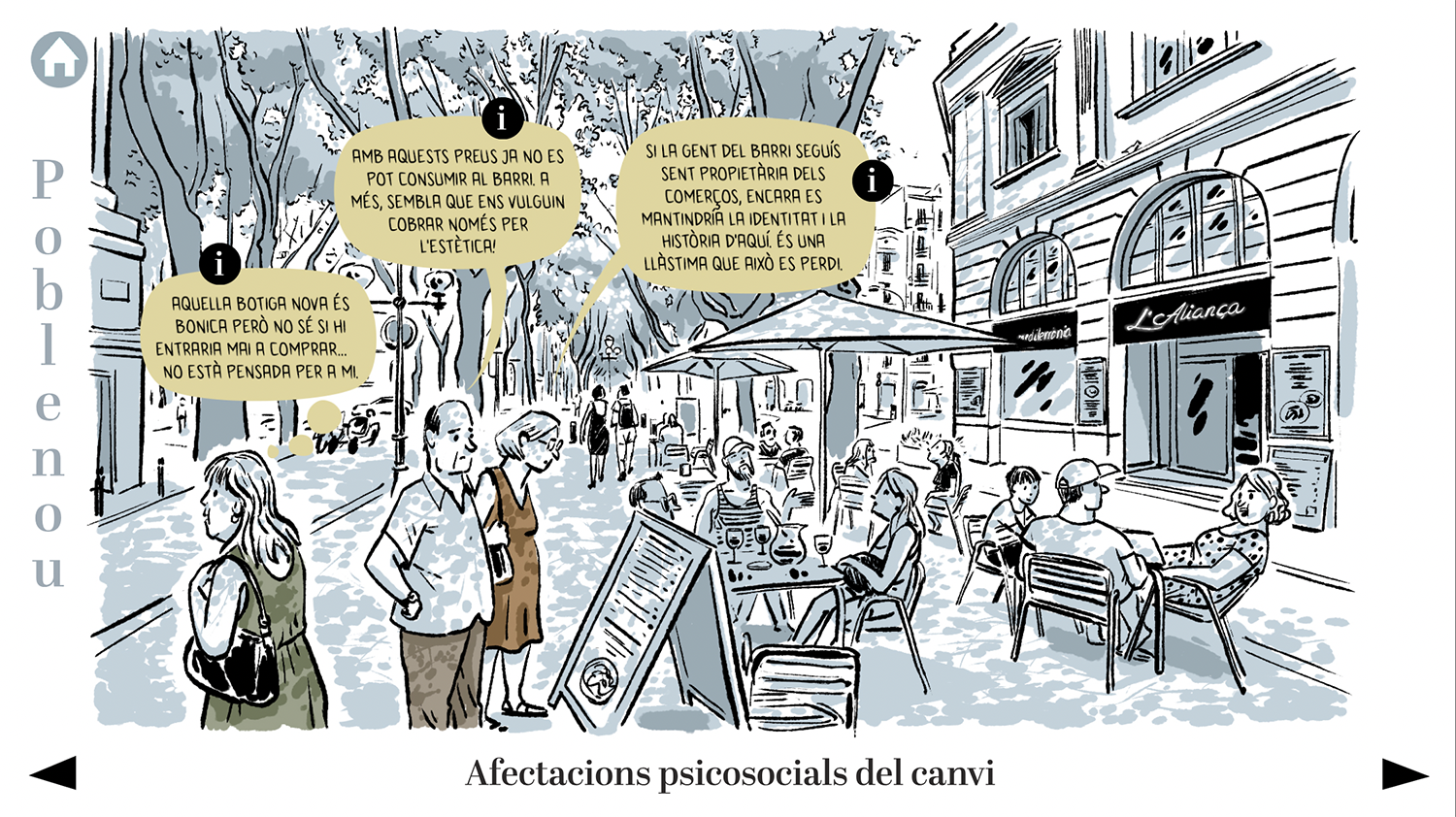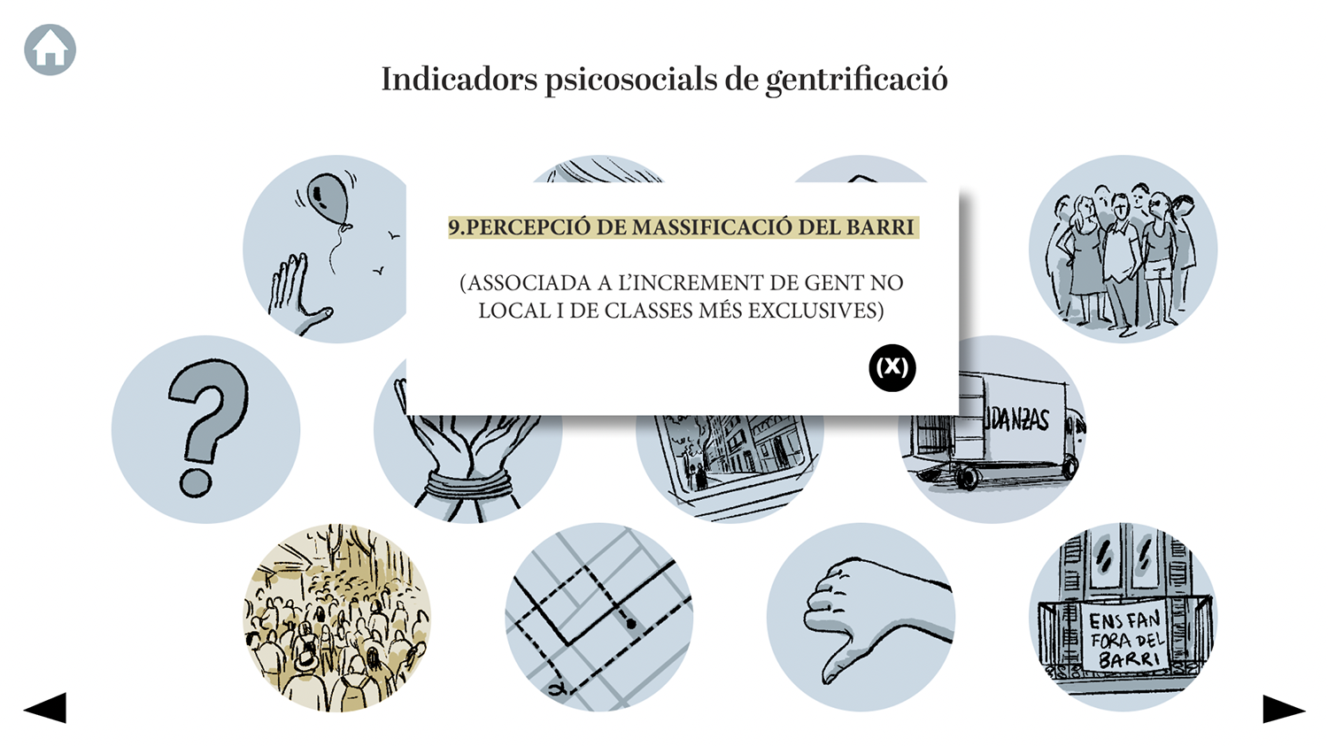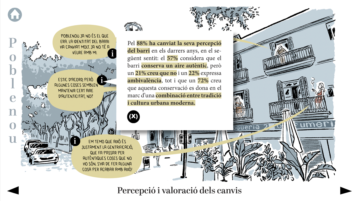 El Grup de Recerca en Interacció i Canvi Social (GREECS) de la Universidad de Barcelona llevó a cabo una encuesta entre habitantes de los barrios de Gràcia y Poblenou de Barcelona como parte de su proyecto de investigación GENTRIPS. Este es el formato que desarrollé para devolución de la encuesta a las personas entrevistadas. Se trata de un PDF interactivo en el que se reflejan los datos más relevantes del estudio y sus interpretaciones.
