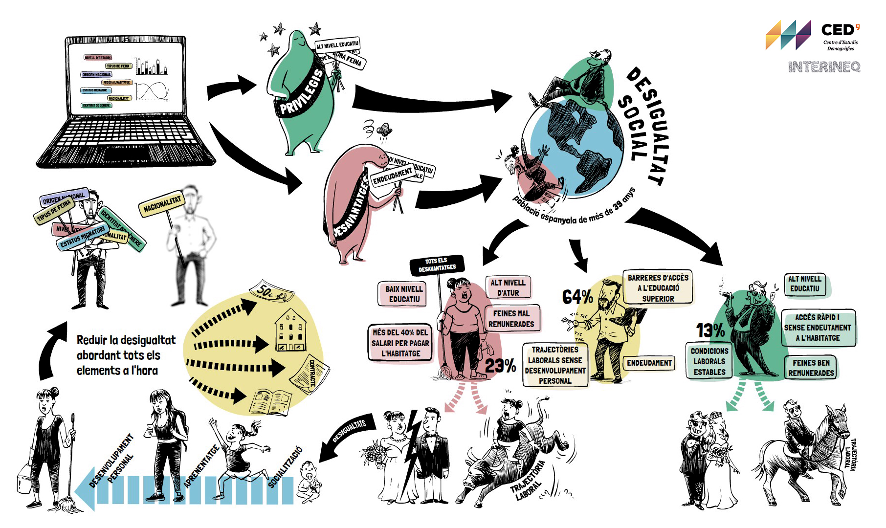 Este trabajo consistió en la realización 4 vídeos y 4 infografías para ofrecer al público general las conclusiones del estudio sobre desigualdades sociales realizado por investigadores del Centre d’Estudis Demogràfics (CED) que formaban parte del proyecto INTERINEQ.