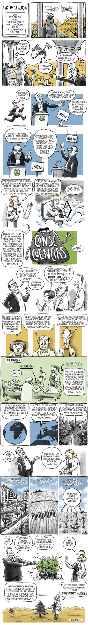 Parte del trabajo realizado para la FIC (Fundación para la Investigación del Clima) dentro del proyecto Memeclim financiado por MITECO. Mi trabajo consistió en realizar 10 viñetas y 3 tiras cómicas como esta para contribuir a la divulgación de los resultados de investigación del proyecto. Aquí pueden verse otras dos tiras publicadas en redes sobre la maladaptación o los escenarios de cambio climático.